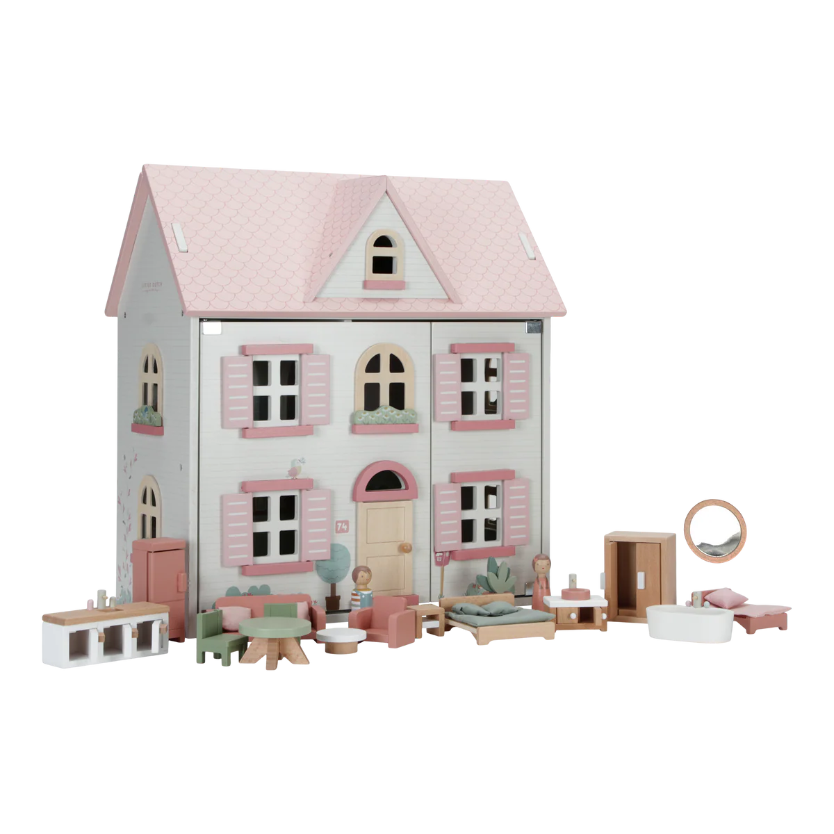 The wooden dollhouse from Little Dutch is the perfect place for children to unleash their creativity. This beautiful house comes in a white color with a pink roof and features wooden shutters that can be opened and closed. The roof can also be opened for extra play fun, and a part of the roof can be transformed into a garden. The interior of the house is very detailed and decorated with beautiful illustrations, both inside and outside. Jim and Rosa, two peg dolls, are included with the dollhouse so children can start playing right away. The house includes a living room, kitchen, bathroom, a bedroom for mom and dad, and a children's room. Each room is furnished with matching furniture and accessories, providing a realistic and attractive play experience. This dollhouse provides hours of playtime and can be further expanded with additional accessory sets that are available. It is a great way to let children enjoy their imagination and creativity WARNING: Not suitable for children under 3 years due to small parts. Choking hazard. Adult assembly required.