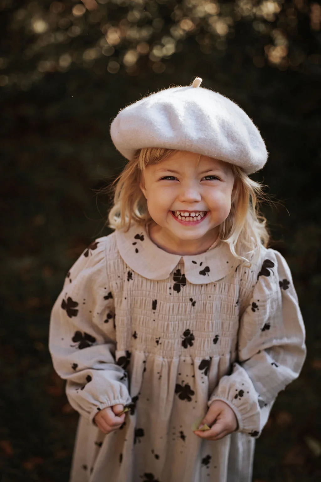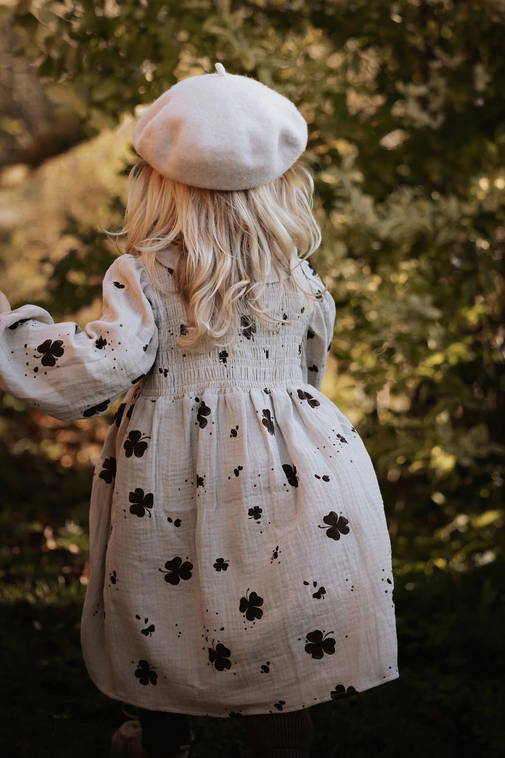 Kjóllinn er með volume-uðum ermum og elastís við úlnlið, auk mjúkur kragi með kringlóttum brún, sem gefur honum fallegan og sætan stíl. Við brjóstið er “smock” sem gerir kjólinn teygjanlegan og mjög þægilegan að hafa á sér. Kjóllinn sker í mittinu og fer út í skyrtu, sem skapar fallegt volume.