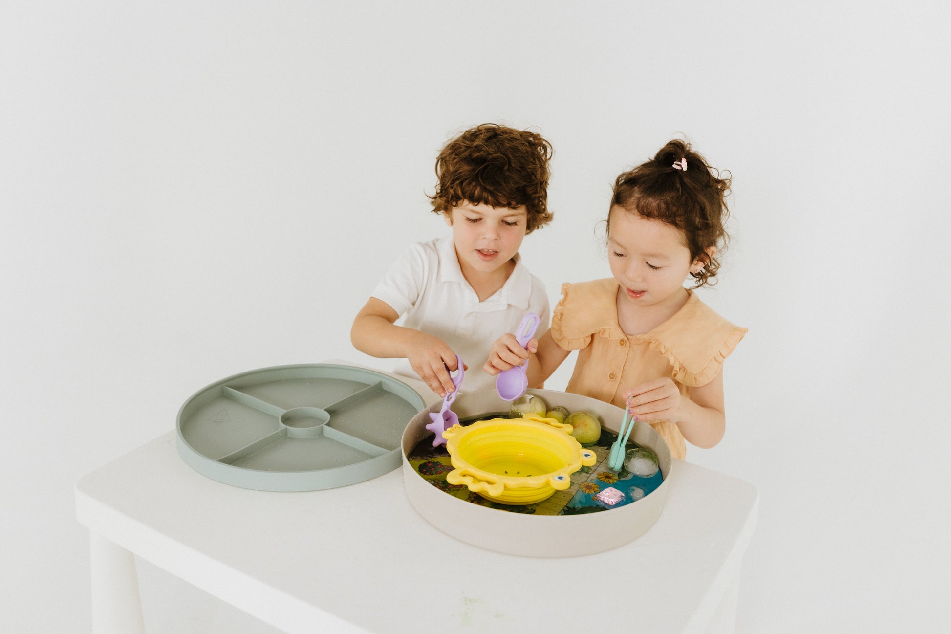 Segðu halló við skynjunarleikinn þinn með Tray Play, sem bíður eftir að fyllast af öllu mögulegu… og fara hvert sem er!