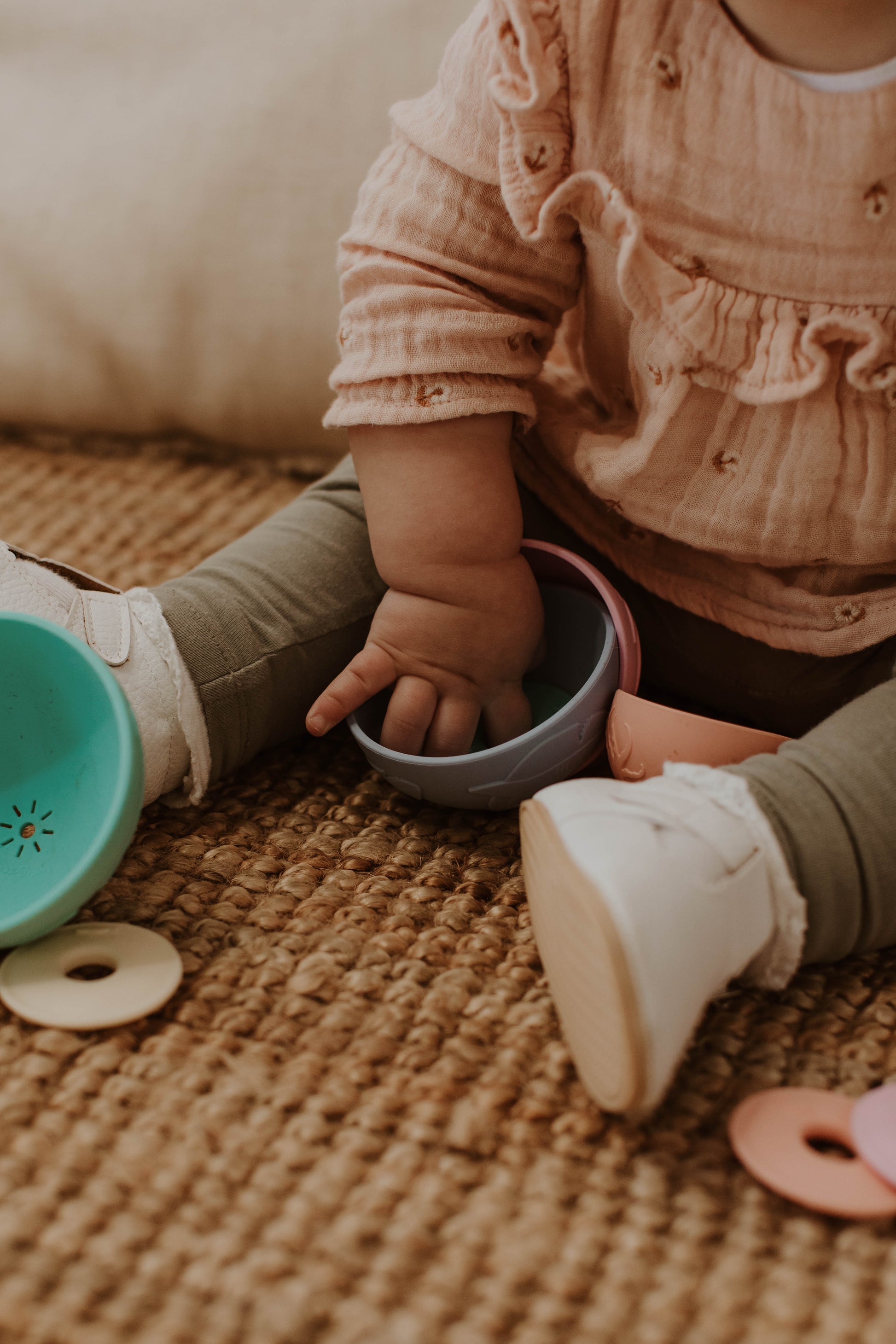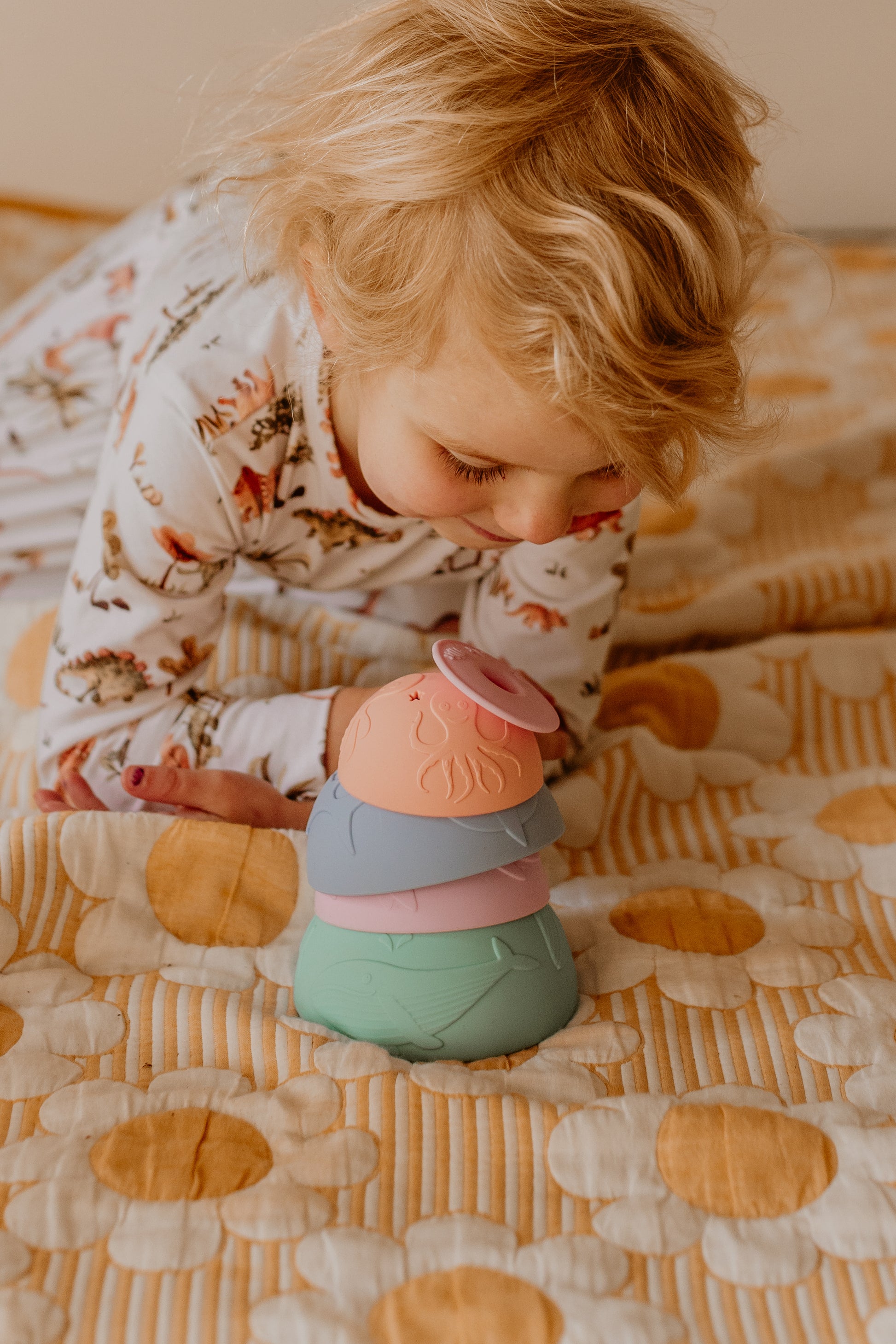 Settið inniheldur 5 staflanlega bolla og 5 fjársjóðsmyntir! Okkar Ocean Stacking Cups hjálpa börnunum þínum að uppgötva undur hafsins í gegnum skynjunarleik. Staflaðu þeim upp, settu þá hver innan í annan, feldu hluti undir þeim, stimplaðu áferðir með sandi eða leir… og paraðu myntirnar við réttan bolla!